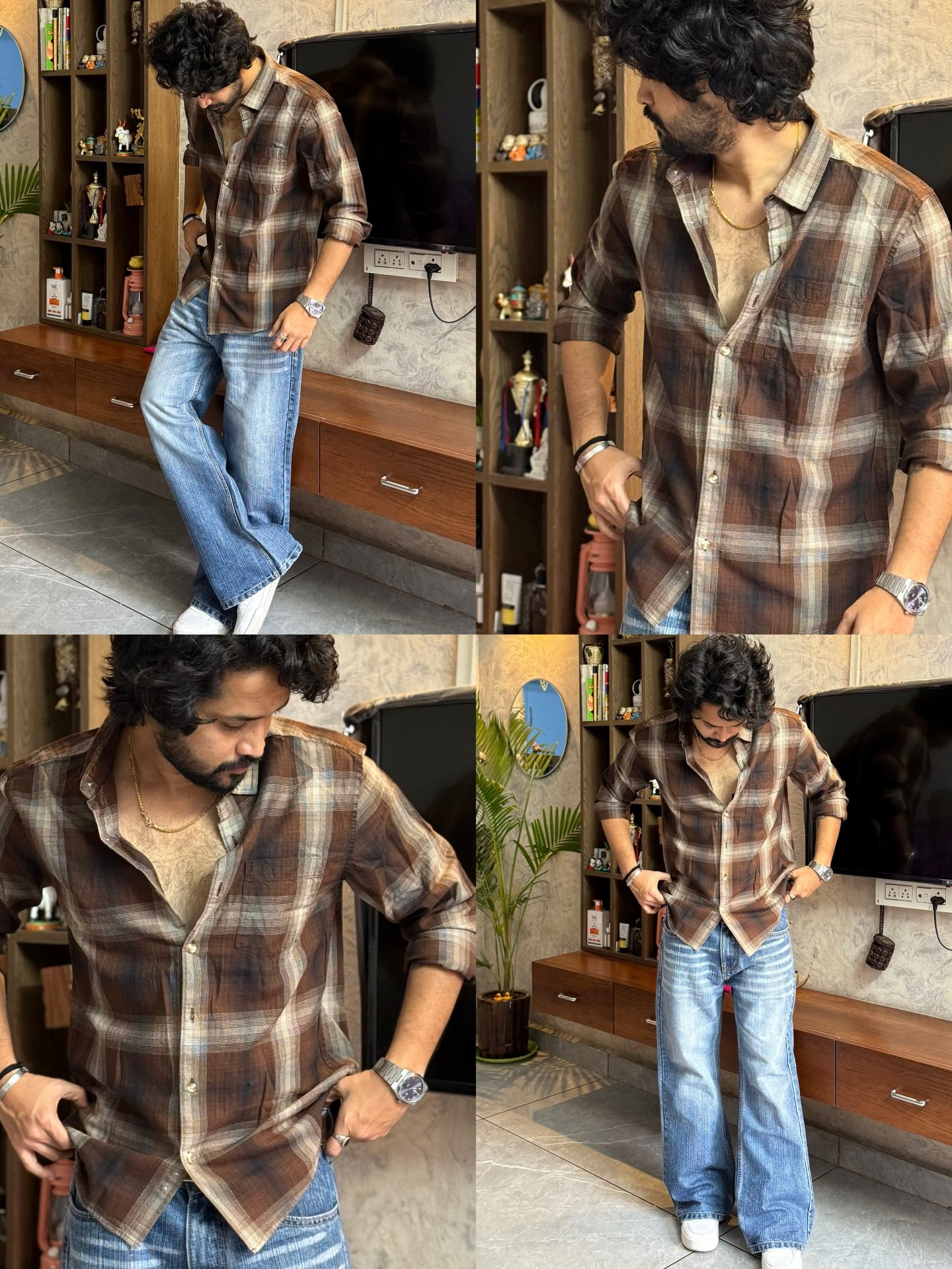 The Blue Contrast: Pair this earthy top with relaxed-fit light-wash blue denim to ground the warm brown tones and create a balanced, heritage-inspired palette.
