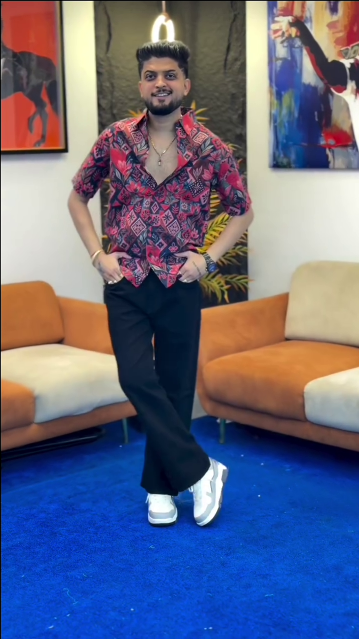 The Urban Contrast: Pair with slim-fit black denim or tailored black trousers (as pictured) to ground the vibrant red tones and create a sleek, edgy look.