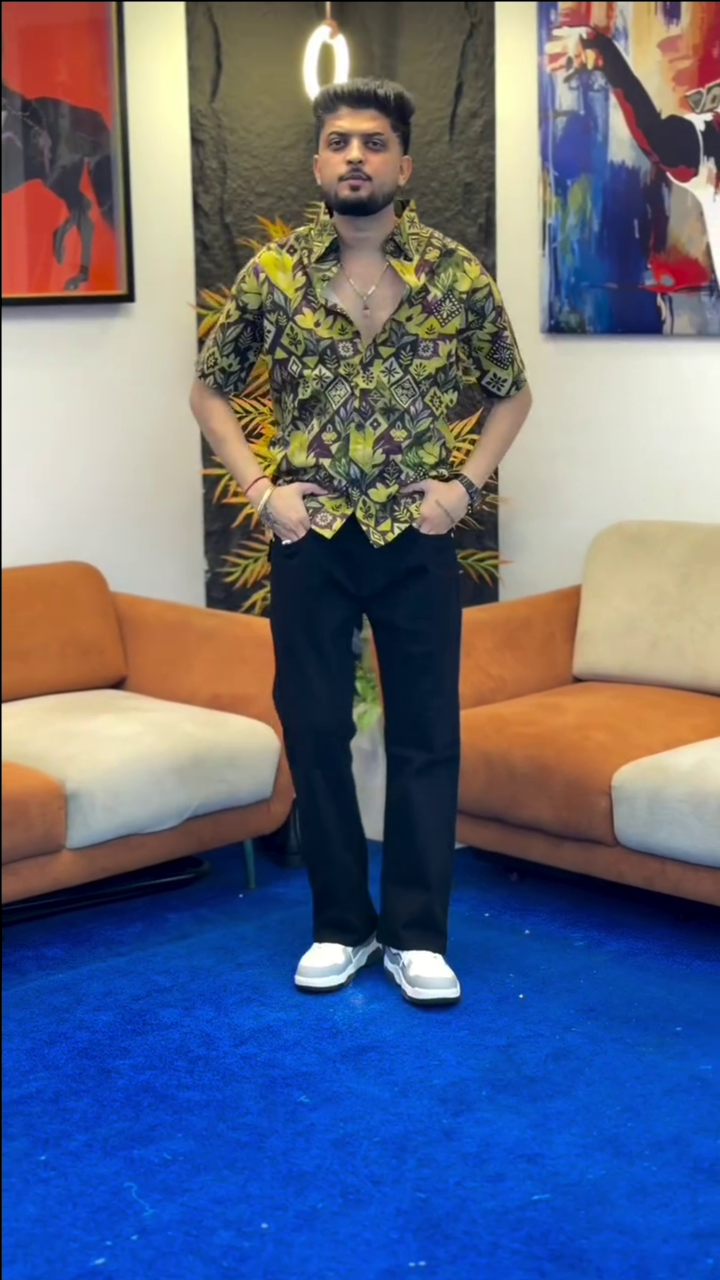 The Dark Contrast: Pair this vibrant top with slim-fit black denim or tailored black trousers to ground the greens and yellows, making the print truly “pop”.