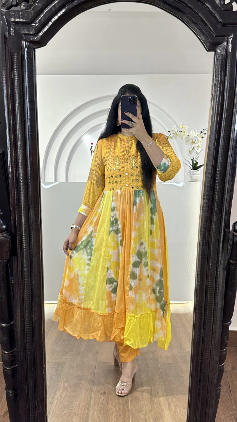 Mulmul frock with pants (straight cut cotton pants, slim fit), has embroidery work on the yoke and comes with fully openable buttons (feeding friendly). Has center slit from the yoke.